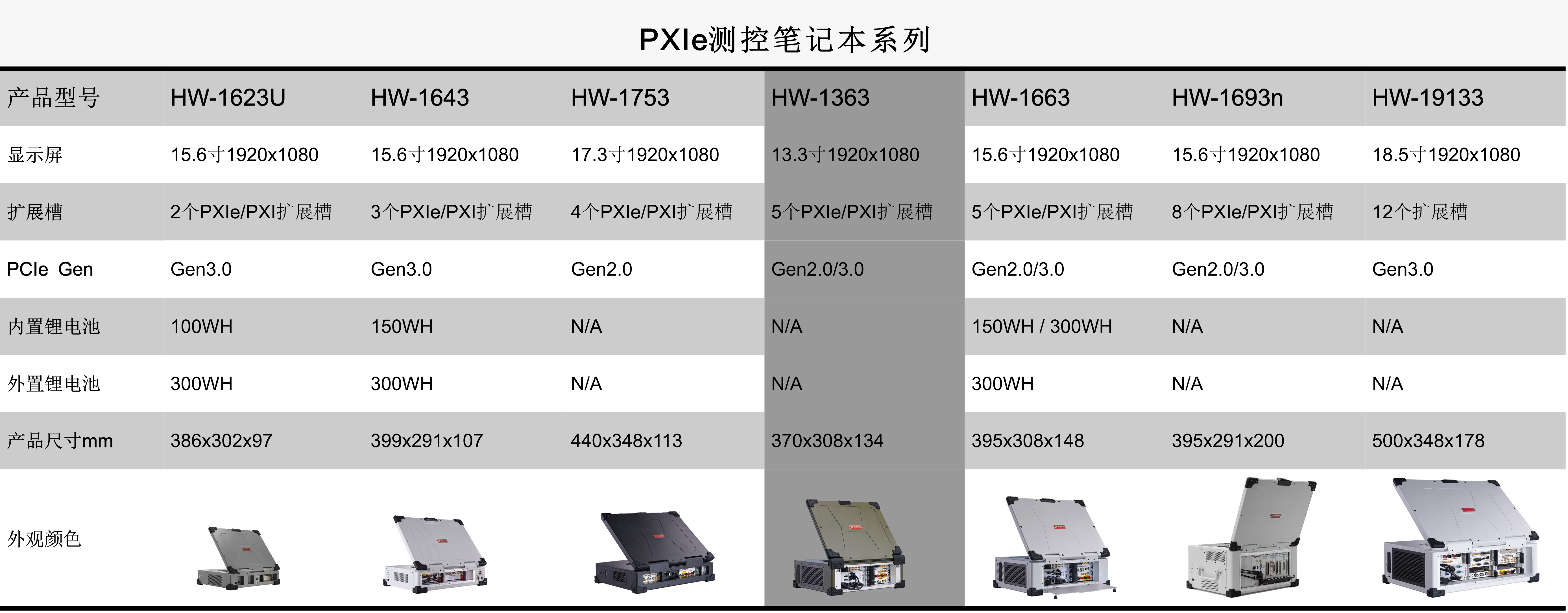 HW-1363是业界首款13.3''内置Intel® CoreTM 6th或9th或11th Gen i7四核八线程或六核十二线程或八核十六线程CPU嵌入式PXIe控制器、PXIe背板、高清显示屏和加固机箱的测控笔记本,此PXIe笔记本采用专业的工业外观设计、全铝镁合金加固紧凑型设计,集成13.3''高清显示屏、多点电容触摸屏或电阻触摸屏、工业触摸板、防水硅胶键盘和测控电源等,具有高集成、强固、便携等特点,适用于各种恶劣的户内外环境或测试设备便携移动的复杂工况。