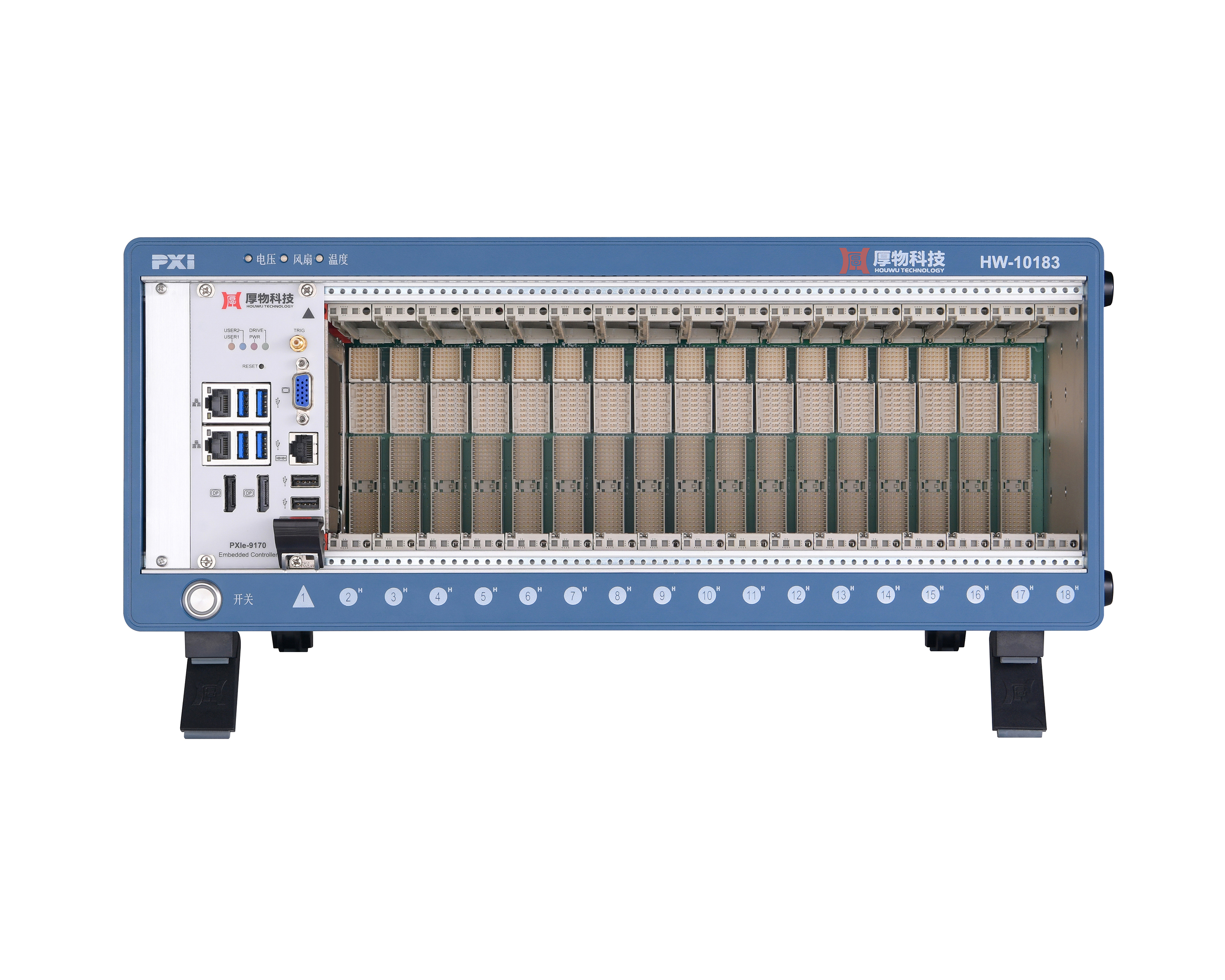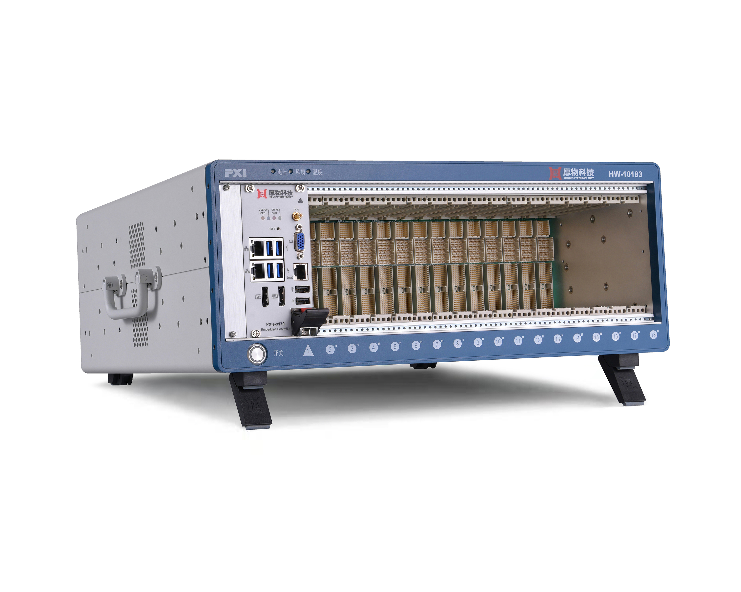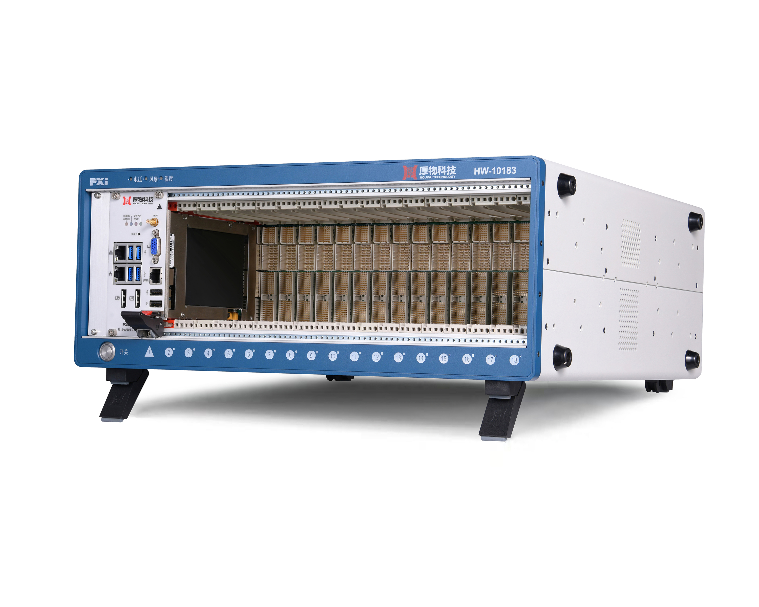 HW-30143d内置厚物科技高性能3U 14槽CPCI背板,符合CPCI总线标准规范,具有1个CPCI系统槽和13个CPCI扩展槽,兼容高速数采、高速数字化仪、数字万用表、航空总线、FPGA、射频及开关等CPCI模块。此测控平台为主动式散热设计,支持PWM风扇转速控制,根据机箱内部温度高低风扇自适应调整转速对控制器及模块进行散热;具有硬件状态监控功能,可实时监控系统电源、风扇、温度状态。