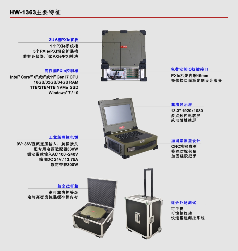 HW-1363是业界首款13.3''内置Intel® CoreTM 6th或9th或11th Gen i7四核八线程或六核十二线程或八核十六线程CPU嵌入式PXIe控制器、PXIe背板、高清显示屏和加固机箱的测控笔记本,此PXIe笔记本采用专业的工业外观设计、全铝镁合金加固紧凑型设计,集成13.3''高清显示屏、多点电容触摸屏或电阻触摸屏、工业触摸板、防水硅胶键盘和测控电源等,具有高集成、强固、便携等特点,适用于各种恶劣的户内外环境或测试设备便携移动的复杂工况。