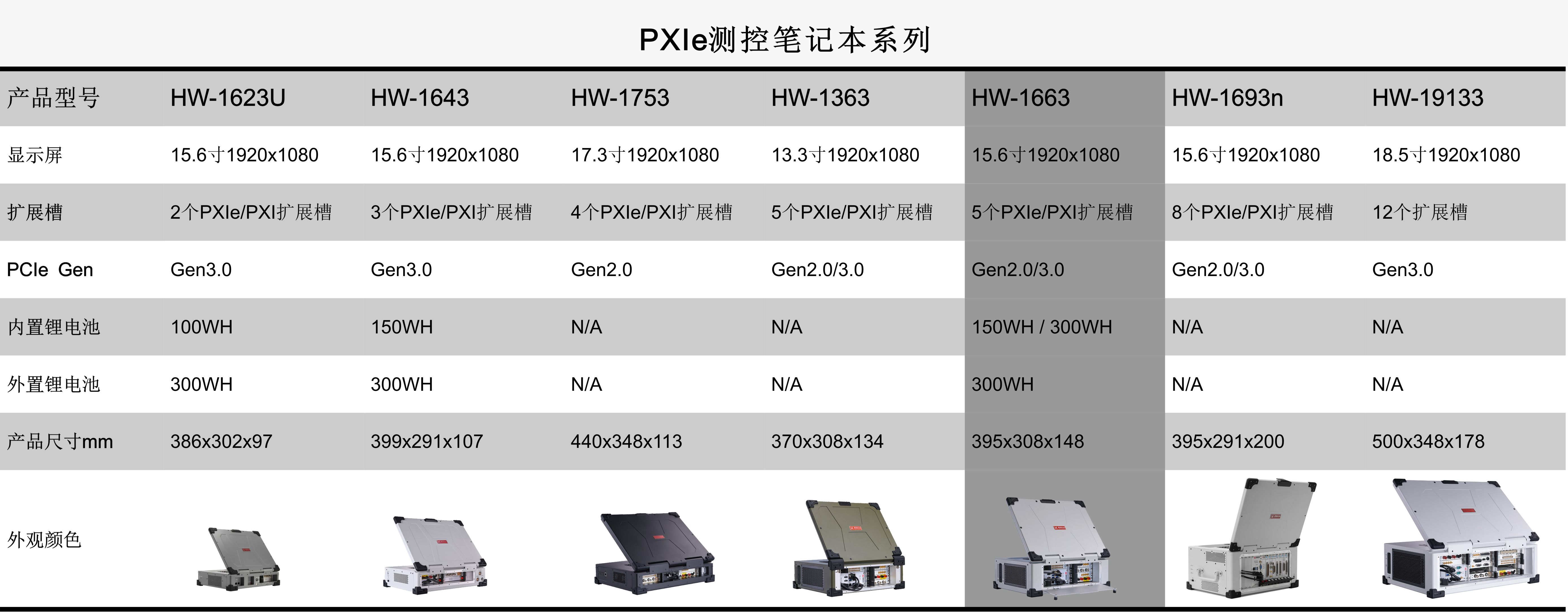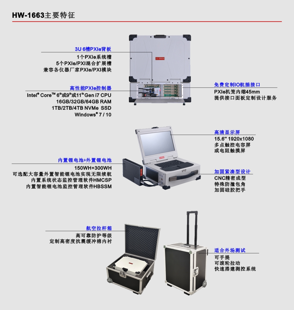 HW-1663是业界首款15.6''内置Intel® CoreTM 6th或9th或11th Gen i7四核八线程或六核十二线程或八核十六线程CPU嵌入式PXIe控制器、PXIe背板、智能锂电池、高清工业显示屏和加固机箱的测控笔记本,此PXIe笔记本采用专业的工业外观设计、全铝镁合金结构加固紧凑型设计,集成15.6''高清工业显示屏、多点触控电容触摸屏或电阻触摸屏、工业触摸板、防水硅胶键盘和智能锂电池等,具有高集成、强固、便携等特点,适用于各种恶劣的户内外环境或测试设备便携移动的复杂工况。
