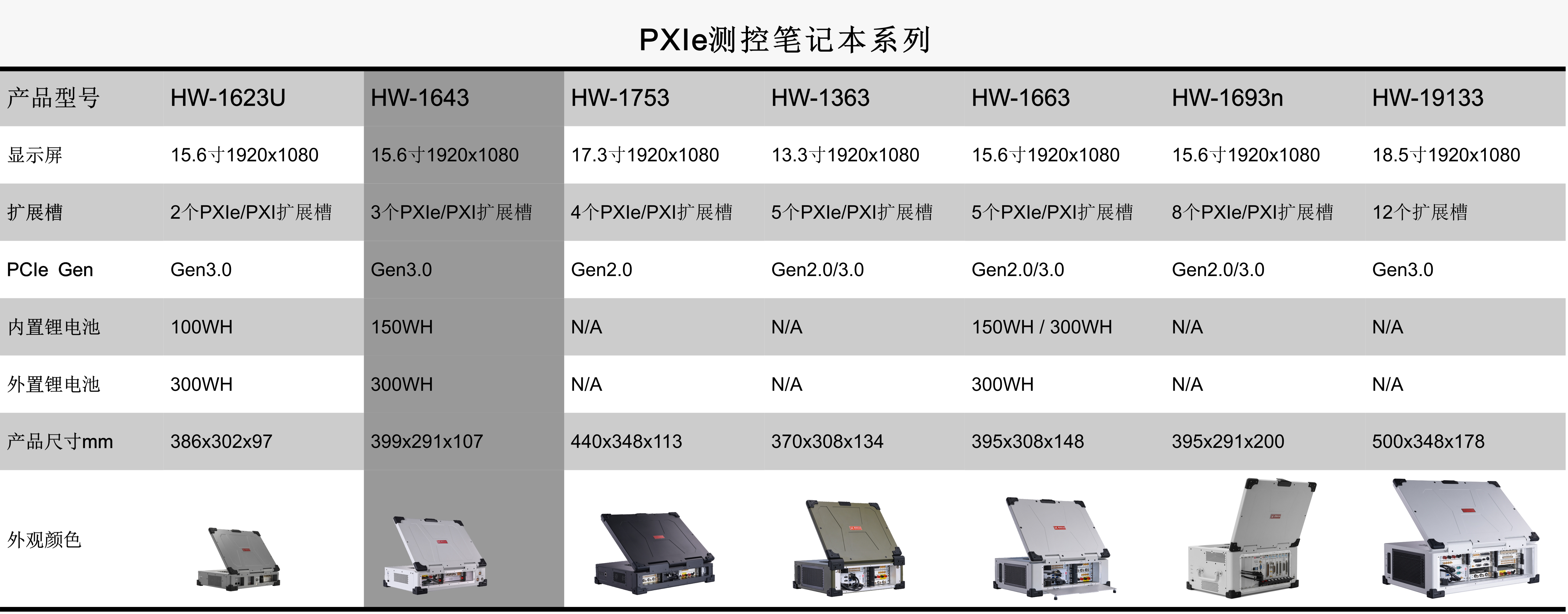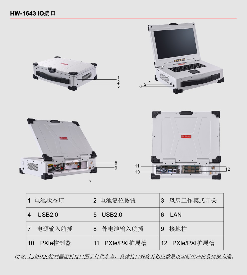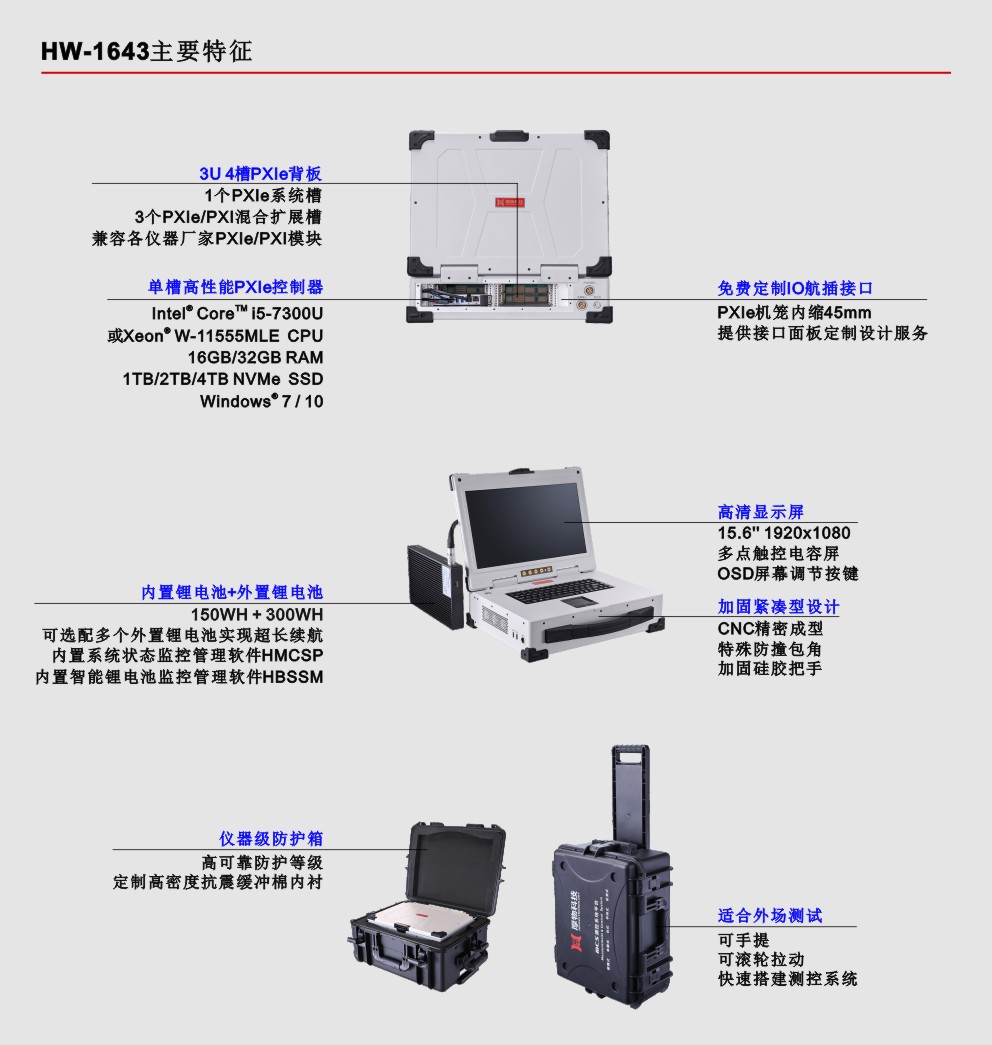HW-1643是业界首款15.6''内置Intel® 高性能CPU嵌入式PXIe控制器、PXIe背板、智能锂电池、高清显示屏和加固机箱的3U 4槽PXIe笔记本,此PXIe笔记本采用专业的工业外观设计、全铝镁合金结构加固紧凑型设计,集成15.6''高清显示屏、多点触控电容触摸屏、工业触摸板、防水硅胶键盘和智能锂电池等,具有高集成、强固、便携等特点,适用于各种恶劣的户内外环境或测试设备便携移动的复杂工况。